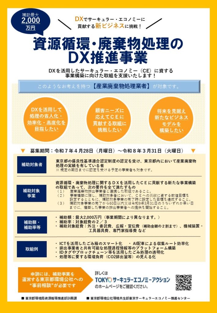 産業廃棄物処理業者が行うDXを活用したサーキュラー・エコノミーに資する事業構築に対する取組を支援します。